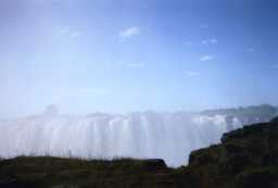 | その後、ガイドのロバートと一緒に国境を越え、といっても、イグアスの滝で ブラジルからアルゼンチンへ入国する様な距離や手続きと違い、車で橋を 渡り、簡単な手続き(ガイドがしてくれる)をしただけだった。距離的に言えば ナイアガラの滝で橋を渡ってアメリカからカナダに入国するのと似ている。 ただ大きく違うのは、治安。実際、ザンビアに入ると怪しそうな、危なそうな 現地人が一杯いる。単に貧しそうなだけかもしれないが、自分は一人では ここに着たくない感じ。それでも、公園内は、そんなことはなかった。 ザンビエ側のビクトリアの滝の観光が始まる。とにかく、滑らないよう1歩1 歩、大地を踏みしめる。(途中) |