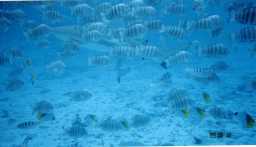 水上コテージの周りは熱帯魚が多く、シュノーケリングには最高 ただし、ダイバー的目線で言う、サンゴの状態はあまり良くなく、魚や透明度 もそこそこといったかんじ。 |