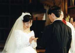 自分達は、ワタベウエディングを通して式を挙げた。 ワタベウエディングは、シャンゼリゼ通りの凱旋門のすぐ近くにあり、式の前にここで、 メークやウエディングドレスの着付けをする。 その後、車が、シャンゼリゼ通りに横付けされ、凱旋門をバックに車に乗り込みアメリ カンチャーチに向かう。 途中、セーヌ川を渡る際、右手にエッフェル塔が見られる。 まさにパリの街の中で挙式を挙げる雰囲気に包まれる。 教会までは、約10分で到着する。 教会に到着すると式の前にビデオや写真撮影、書類の記載、結婚式の打ち合わせを し、いよいよ式本番を迎える。 神父さんの言葉は英語で、自分達の返事の言葉も英語だが心配ない。 要は、どんな時でも一生涯相手のことを愛するかと尋ねられたら、正直に、はい(I will) と答えればよい。 式はあっという間に済んでしまった気もするが、それでも美しいステンドグラスの光の中 で力強く「I will」と答えたシーンは鮮明に残っている。 |