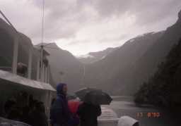 フィヨルド オスロ、ベルゲン鉄道の途中、フロムからフェリーに乗り換えフィヨルドに向かう。 両サイドの崖は、雨のためか100m級の滝が何本も流れ落ちている。船は、世界一 長いソグネフィヨルドから枝分かれしたアラウンドフィヨルド、ナールフィヨルドを通って いく。雨ではったが、それでも大自然の絶景を楽しめる。 |