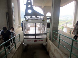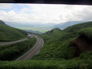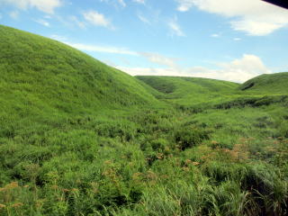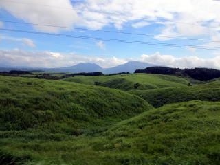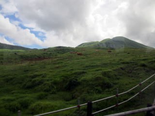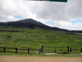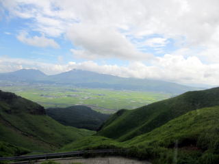 高岳、中岳、根子岳、烏帽子岳、杵島岳の阿蘇五岳より成る活火山。 印象に残ったのは、噴煙を噴き上げ、硫黄の匂いを撒き 散らす中岳第一噴火口の、そこに落ちたら体が溶けてし まいそうな雰囲気の火口湖の青い水の色と烏帽子岳の 牛や馬が放牧されている草千里ヶ浜の鮮やかな緑の色。 この2つの色は、30年たった今もまぶたに残っている。 2012年8月、79歳になる父と31年ぶりに再訪。 草千里ヶ浜の緑の美しさ、阿蘇の雄大さは不変だった。 阿蘇市ホームページ 阿蘇市観光協会ホームページ 阿蘇山ロープウエイ |