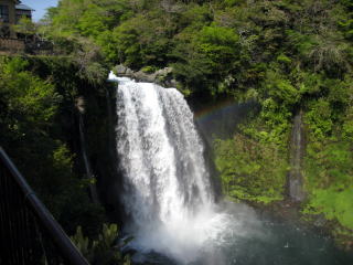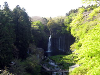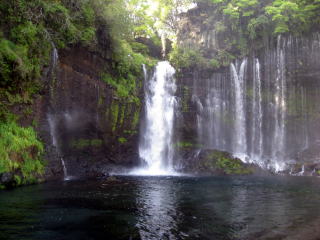 富士山の雪解け水が絹糸を垂らしたように何本も 流れ落ちる滝。 高さ20m、幅200mとのことだが、幅200mは言 い過ぎでは。 中学の修学旅行以来30年ぶりに訪れた。 昔、みんなで弁当を広げて食した場所は、立ち入 り禁止区域となっており、変わり果てた姿に時の流 れを感じた。しかし、滝の水量や滝壺の水のきれい さは、あの時代よりもいい意味で変化していて、マイ ナスイオンの中、心が洗われた。 アクセス:<バス>身延線富士宮駅から富士急静岡 バスで約30分「白糸滝」下車。 <車>東名高速富士ICから西富士道路、 国道139号経由し17km 富士宮市ホームページ(白糸の滝) |