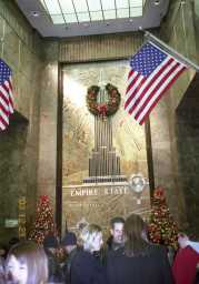 1日目 夜、エンパイア・ステート・ビル 高さ381m、102階建てのマンハッタンの中央に位置する世界 一有名なニューヨークの象徴的ビル。 展望台は86階にあり世界中から年間250万人以上の観光客が ここを訪れる。 |