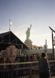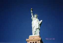 自由の女神 アメリカの独立100周年を記念してフランスから寄贈され1886年 に完成したアメリカの象徴的像。 高さ46m、右手にはタイマツをかかげ、左手には独立宣言書を携 えている。 今回はテロ事件後のため自由の女神の中に入れず残念。 前回(1989年)は、自由の女神の中に入れ王冠や松明の所まで 登れた。 女神の中に入るのと入ってないのではかなり自由の女神のイメー ジに差が生じると思う。 |