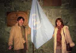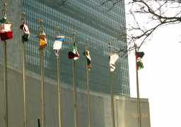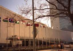 国連本部 イースト川沿いに立つ高さ165m、39階建ての青いガラスのビル。 ビルの前には加盟国の国旗がずらりと並んでいる。 今回は1日観光で訪れたため時間がなく国連のガイドツアーに参加 できなかったため表面的な内装や建物しか見られなかった。 やはり時間があればガイドツアーに参加したほうがよい。 また前回(1989年)に比べ国連内に入るのに手荷物検査などきび しく他国に入国するみたいで驚かされた。 |