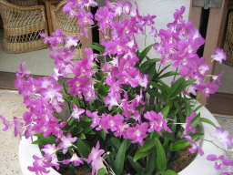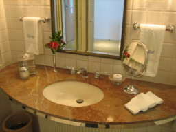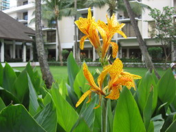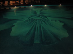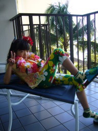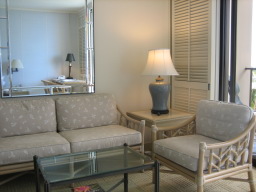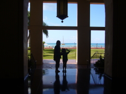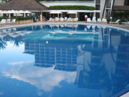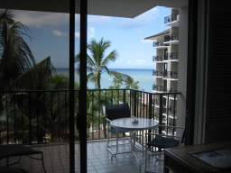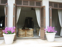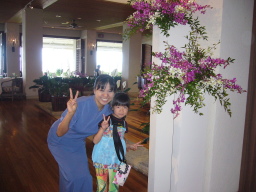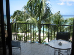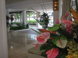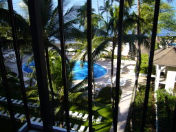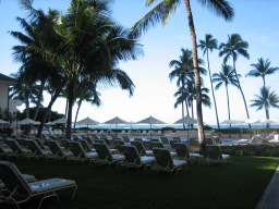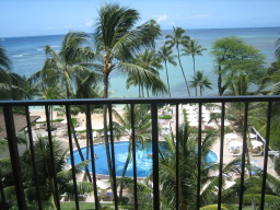 部屋からの景色 今回の部屋は、オーシャンフロントで部屋からは海が見え、また青い欄の花が 描かれたオーキッドプールも見られる。 同じオーシャンフロントでも、両親の部屋の方がベランダの前にやしの木がなく 海がきれいに見え、部屋によって景色に多少の違いがある。 |