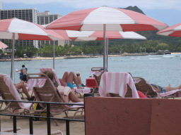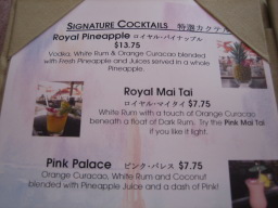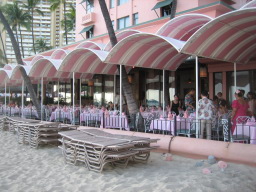 マイタイバー ワイキキビーチに面するザ・ロイヤル・ハワイアンのビーチサイドバー。ピンクパレスをバックにたくさんのピンクと白のパラソルが並んでひときわ目をひく。「マイタイ」発祥のバーとも言われている。 今回は、ワイキキビーチで体を焼いた後、昼食も兼ねてここを利用した。ビーチのすぐ近くで、ラフな格好でも問題ないので使いやすいバー。 |