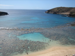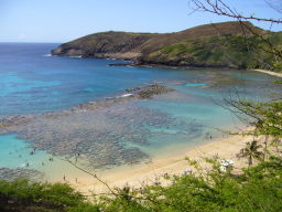 ハナウマ湾 1万年前の火山活動によってできたエメラルド・グリーン、ブルーの美しい馬蹄形の湾。 湾内には珊瑚礁が広がり、自然保護区に指定されているため魚も多く、シュノケリングやダイビングスポットとしても有名。 2004年全米ナンバーワンビーチ。 |