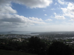 マウントイーデン 標高196m、噴火口跡にできた小高い丘。 頂上からは、オークランドの街並みが見渡せる絶好のヴ ゥーポイント。丘の斜面には、牛が放牧されている。 |