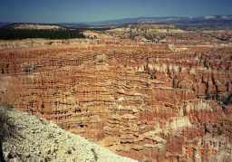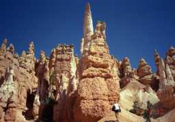 28日目、ブライスキャニオン ユタ州南部に、南北約40kmにわたって延びる約4000万〜5000万年前の地層よりなる峡谷。ETの指のような岩山など形と色の変わった地形が広がっている。グランドキャニオンを神がもっと繊細に彫刻刀で彫ったかんじ。またトレイルは、グランドキャニオンほどハードでなく、ゆっくり歩いてこの地形を楽しめる。 |
