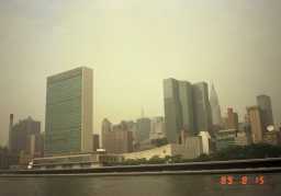 国連本部 イースト川沿いに立つ高さ165m、39階建ての青っぽいビル。ビルの前には加盟国の国旗がずらりと並んでいる。 |