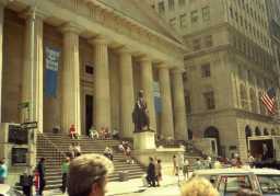 ウォール街 世界金融の中心地。 かつてマンハッタンに初めて入植したオランダ人が外敵からの攻撃を防ぐために築いた丸太の防壁(ウォール)に由来する。 今回はツアーでニューヨーク証券取引所を見学した。 |