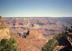 <当時の日記より> ラスベガスからグランドキャニオンへセスナで向かう。 出発する。すごく揺れる。急に体が下にいく。汗がでる。降りたくなる。 しかし、そんな気持ちも吹っ飛んでしまう光景が次々に続く。 まず、湖とフーバーダムが見えてくる。その後、地球とは思えない岩山 の世界が延々と続く。やがて、さらにこれらを凌駕する絶景が続く。グラ ンドキャニオンである。セスナが宇宙船に思える。しばらくすると、谷の中 に緑が見えてくる。両サイドにキャニオン、真ん中に森林。キャニオンが 遠ざかり、緑の中に着陸する。 |