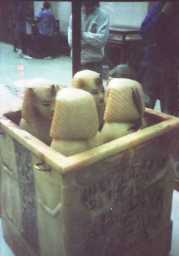 ツタンカーメン黄金のマスク 2006年、特殊なX線で精査したところ、黄金のマスクは、純金ではなく、 一部銀が含まれていることが判明。 この銀のため、かえってより黄金の輝きが増しているらしい。 他に、額のコブラには、カーネリアンが、目の縁の青いラインは、ラピス ラズリの宝石が装飾されていたとのこと。 |